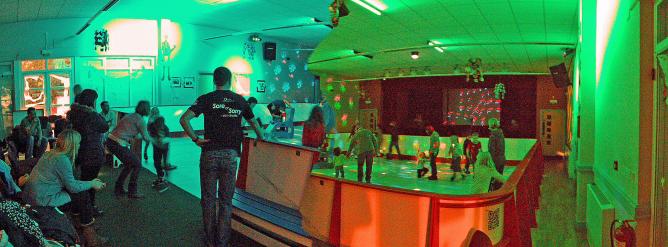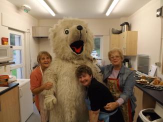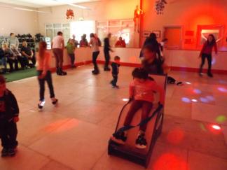 The Main Hall at the Centre was transformed to offer a 9 x 8 metre synthetic ice rink during the half term holiday. It proved a very successful event and was enjoyed by all ages. Slippy the Polar Bear made guest appearances to amuse the children and our Cafe helpers (see photo above). Our lighting and sound system created a terrific atmosphere to show off the facilities at the Centre.