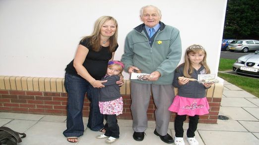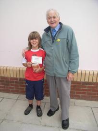 Brinley John, one of the oldest members of the Gardening Club, hands over the awards to Joint Winners Megan and Carys Lloyd, 2nd place - Nia Morgan and 3rd place- Cameron Lake